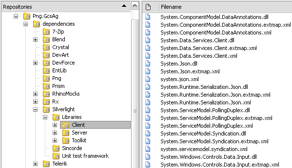 - In the DV branch there is a folder called Dependencies, where we keep all the DLL’s and third party references. All projects in the solution(s) then reference the DLL’s from the Dependencies folder, and NOT from their local Program Files installation of the tool in question. This serves two purposes: a) it ensures that, regardless of which version of which tool is installed locally, that all of the DLL’s required to compile the app are in SCM and are in a folder that has the same relative path (i.e. ..\dependencies) on every developer’s hard drive. This avoids so many seemingly random errors that crop up when a developer links a project to their own Program Files menu. NOTE: This pretty much invalidates the use of “Add Reference, Select from List” for all but the core MS DLL’s, as you will almost always have to pick “Add Reference, Browse” to get the reference to point to the Dependencies folder. It also means that most project creation wizards will produce a project that you then have to remove and recreate the references in so that they point to the Dependencies folder that the wizard knew nothing about.In our projects, DLL’s from: C:\Program Files\Reference Assemblies and C:\WINDOWS\Microsoft.NET, are referenced from those locations, all other DLL’s are referenced from the copies stored in the Dependencies folder. For example, the C:\Program Files\Microsoft SDKs\Silverlight\v3.0\Libraries folders are copied over to the Dependencies\Silverlight\Libraries folder.