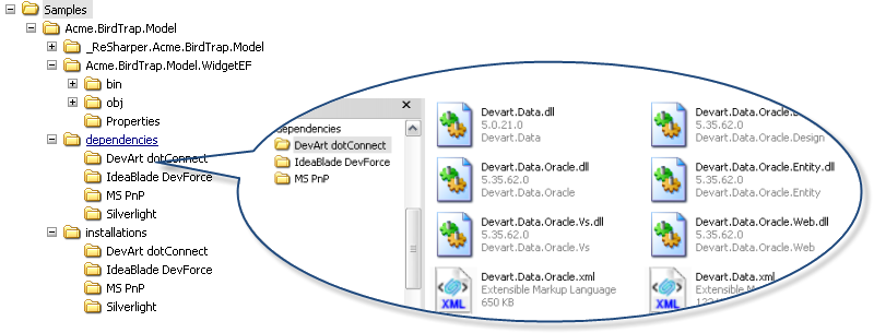 dependenciesfolder. - Contains all the DLL files that are referenced by the projects in the Solution, except the ones that are part of the Microsoft .Net Framework. In so far as technologies like Silverlight are installed to the GAC as extensions to the .Net Framework, those DLL’s are referenced from the GAC and are not copied to the dependencies folder. All other referenced DLL’s ARE copied to dependencies though. This includes the Silverlight Toolkit files, the IdeaBlade files, DevArt files, etc.