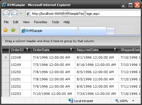 <Button Content="Save" Height="23" Name="SaveAllButton" Width="75" HorizontalAlignment="Left" IsEnabled="{Binding Path=SaveAllButtonEnabled}" Command="{Binding Path=SaveAllCommand}" /> - Build and Run. After a moment or two, you should see the grid, fully populated with Orders. Try editing some of the orders and hit Save All. Refresh the page to see that the changes were saved.